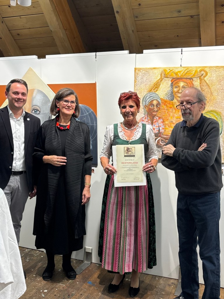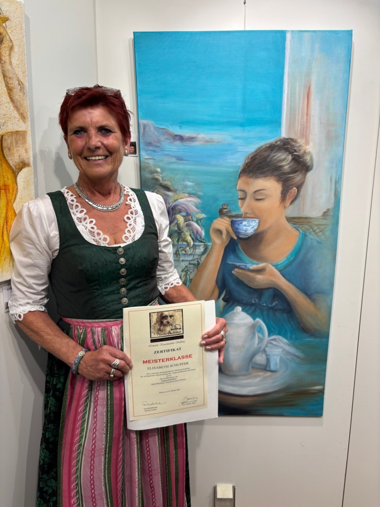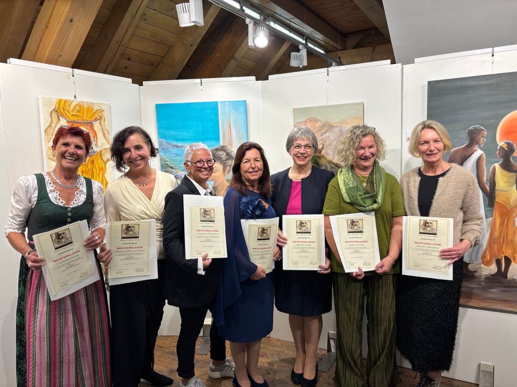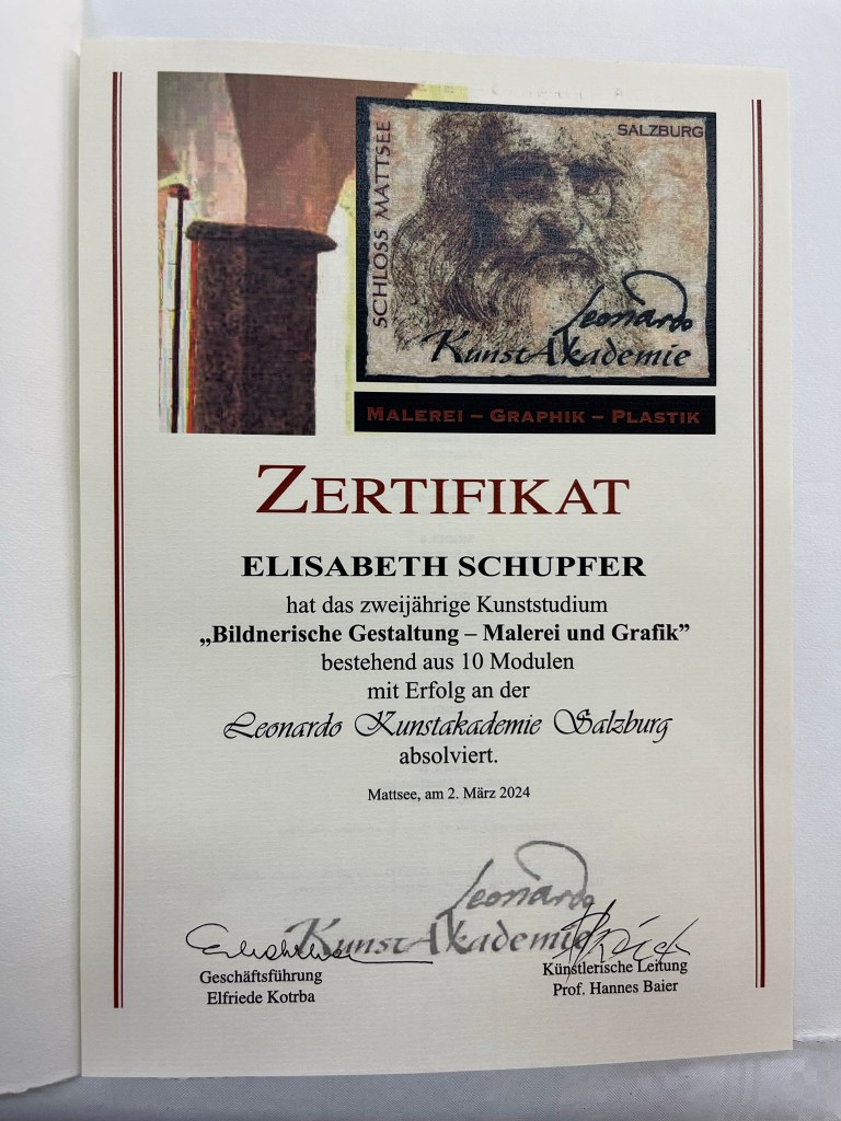 Am 18.10.2025 wurde mir mein Zertifikat ‚Meisterklasse’ von der Leonardo Kunstakademie überreicht. Nach 4jähriger Jahre Ausbildung in Mattsee durften wir an diesem besonderen Tag unsere Abschlussbilder präsentieren!